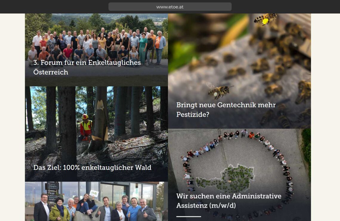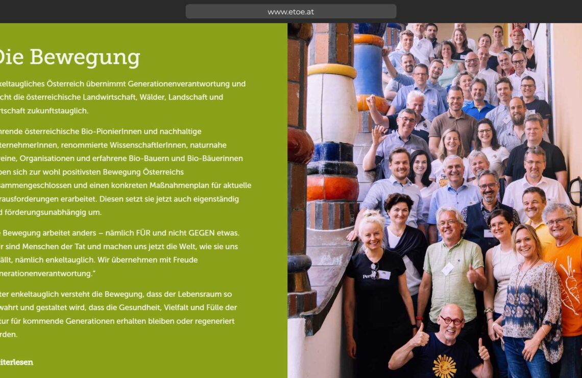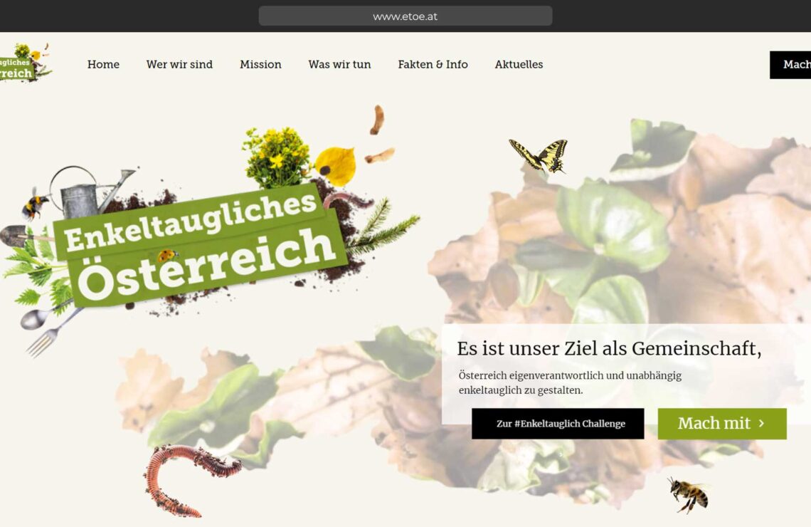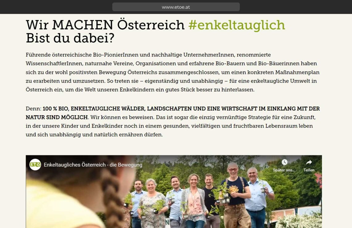 Wir MACHEN Österreich #enkeltauglich Bist du dabei? Führende österreichische Bio-PionierInnen und nachhaltige UnternehmerInnen, renommierte WissenschaftlerInnen, naturnahe Vereine, Organisationen und erfahrene Bio-Bauern und Bio-Bäuerinnen haben sich zu der wohl positivsten Bewegung Österreichs zusammengeschlossen, um einen konkreten Maßnahmenplan zu erarbeiten und umzusetzen. So treten sie – eigenständig und unabhängig – für eine enkeltaugliche Umwelt in Österreich ein, um die Welt unseren Enkelkindern ein gutes Stück besser zu hinterlassen.