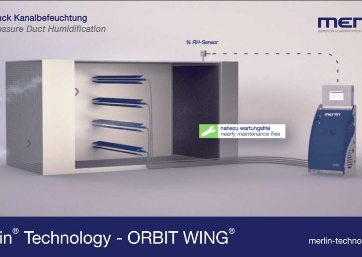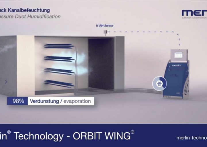 Das patentierte* merlin® Luftbefeuchtungssystem ORBIT WING® lässt sich problemlos in jede bestehende Lüftungs- oder Klimatechnikanlage integrieren und sorgt zusammen mit Feuchtesensoren und der Steuerungsautomatik für effiziente und hoch wirtschaftliche Luftbefeuchtung.